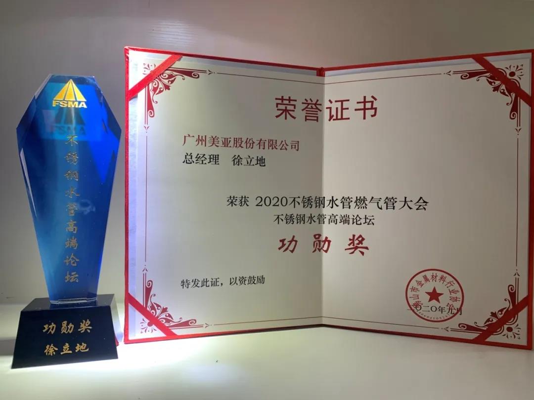 会上还对做出突出贡献的不锈钢水管高端论坛成员企业负责人进行表彰,广州美亚总经理徐立地先生荣获功勋奖,胡飞先生在隆重的颁奖仪式上作为代表上台领奖。